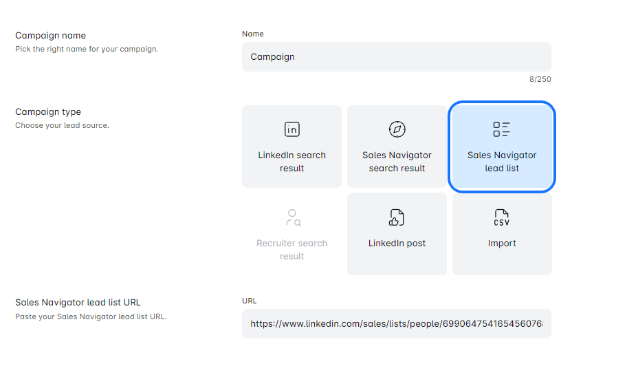 - Once you’ve filled your list with leads, it’s time to set up your campaign! Copy the URL of your Leads List, paste it into the designated area in the Leadscope, and give your campaign an awesome name.