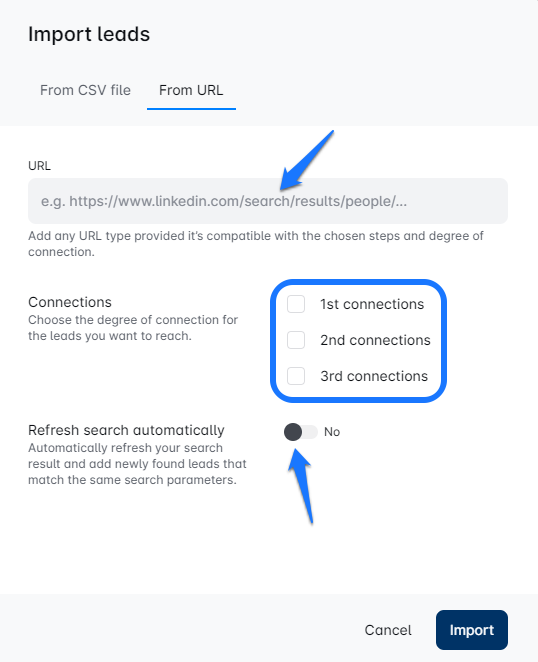 Or insert a Search URL: Just enter the URL, and youโre all set! ๐ You can then pick your preferred connection degree and decide if you want to enable automatic linking for your search. ๐๏ธโจ