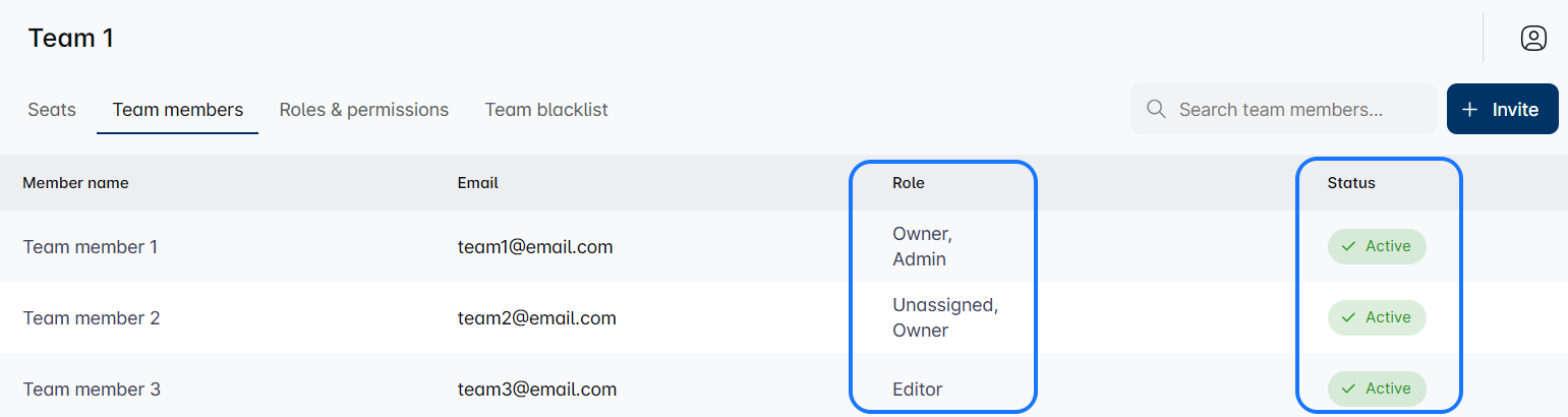 Click on 'Team members' tab for an overview of your team’s current lineup where you can see everyone’s roles, invite new members, and more.