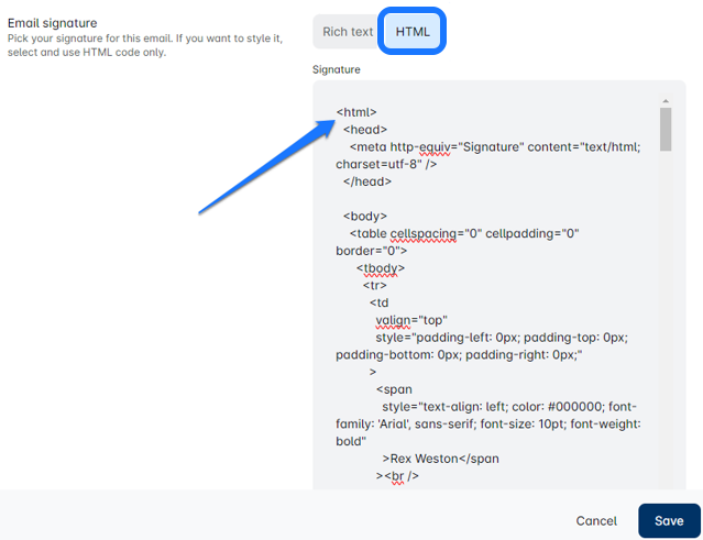 Once you’ve selected the HTML option, paste your HTML code with your signature. Don’t forget to check the preview and make any adjustments before finalizing it. When you’re satisfied, click ‘Save’ to save it!