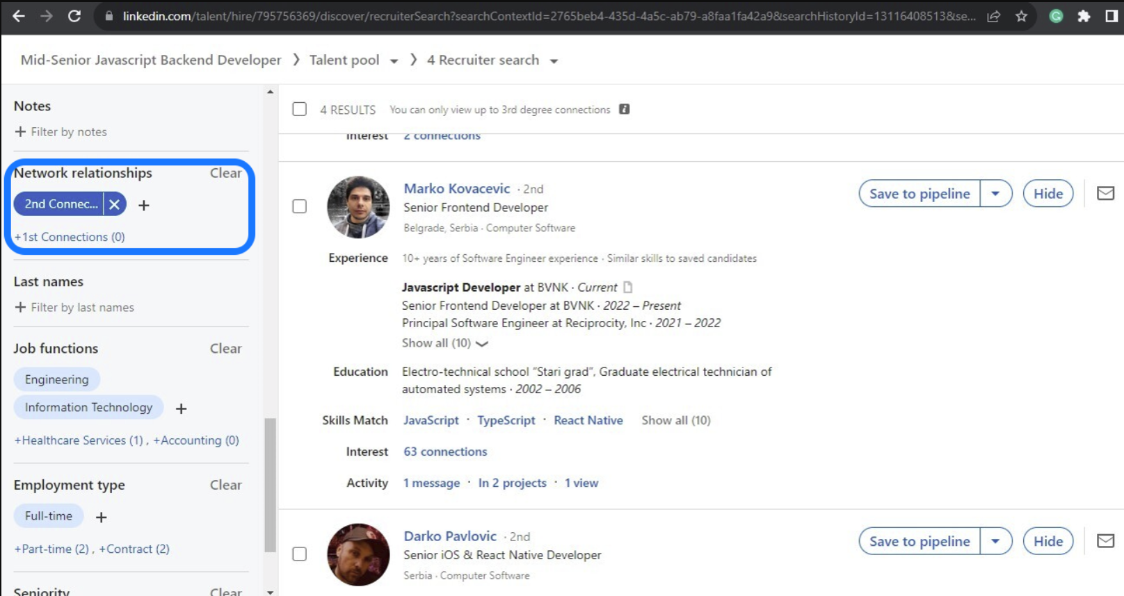 - This part is super important! Make sure the Network Degree connection type matches in both Leadscope and LinkedIn Recruiter. Use the Network Relationships filter on LinkedIn Recruiter to confirm this—it's key to targeting the right audience. 🔍