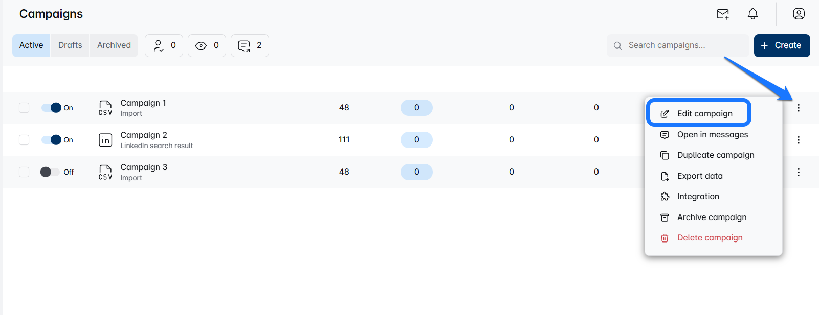 - Alternatively, you can enter edit mode by selecting a campaign and then choosing the 'Edit Campaign' tab from the Leads page.
