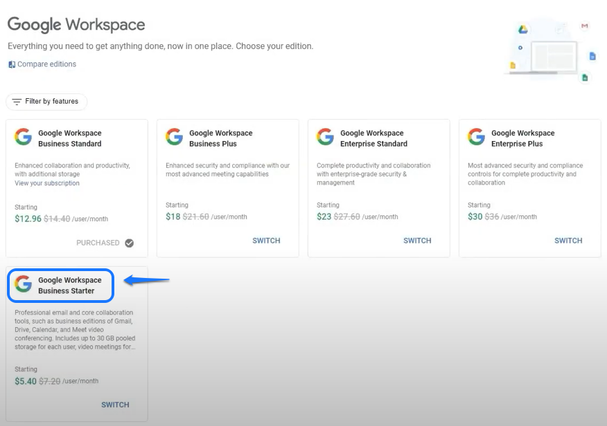 Since Google Workspace doesn’t offer any plan other than the most popular Business Standard, you can & should go and change it to a more affordable plan.