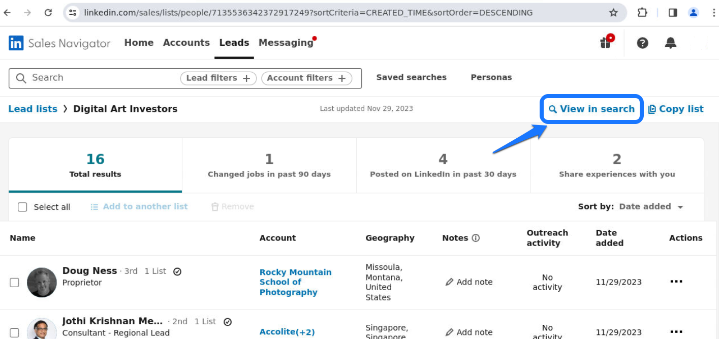Start by adding all the people you want into a Leads list inside Sales Navigator. Once you’re ready, look for the View in search button and click it: