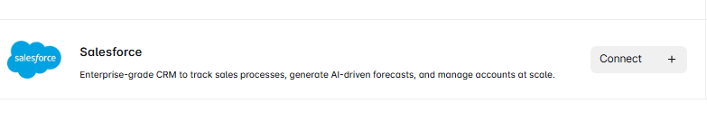 Go to the Team Integrations tab, where you’ll see all available integrations. Find Salesforce and click Connect to begin.