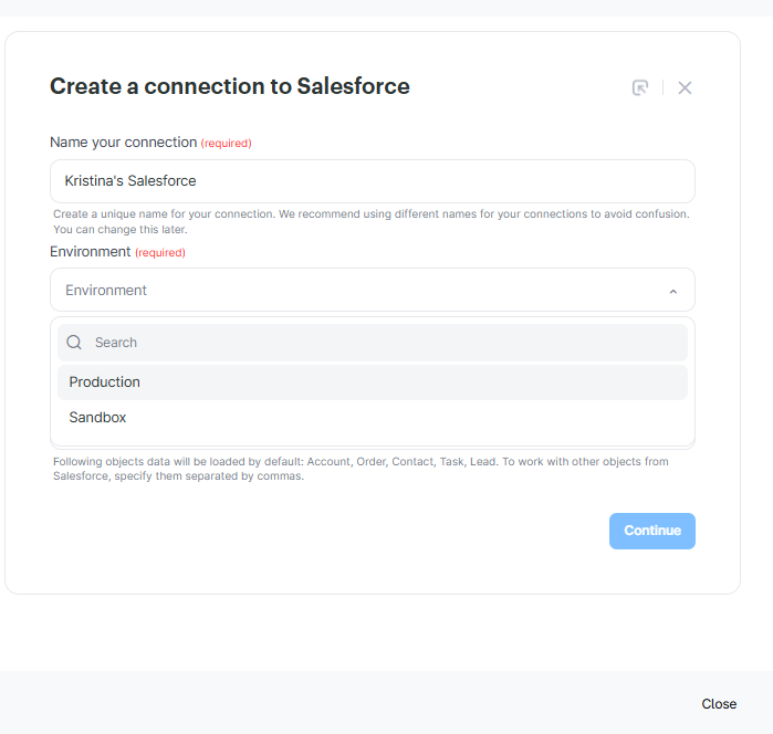 Name your connection, select Production under Environment, and click Continue.