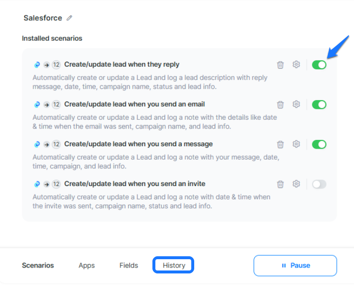 Give it a few moments while Leadscope installs the automations you selected earlier. Once completed, you can toggle automations on or off depending on your needs. You can also use the History tab to review all triggered automations in one place. 📊
